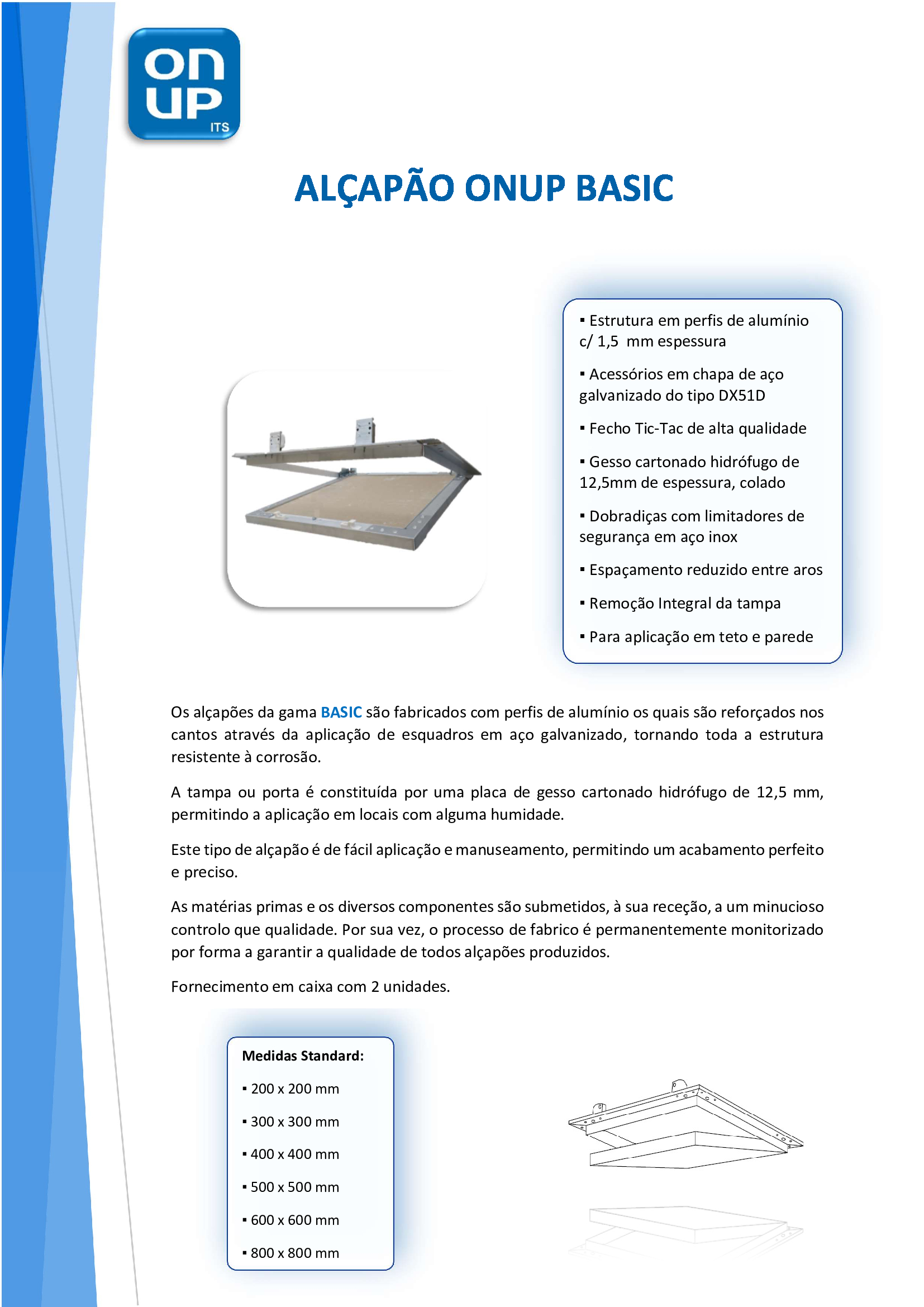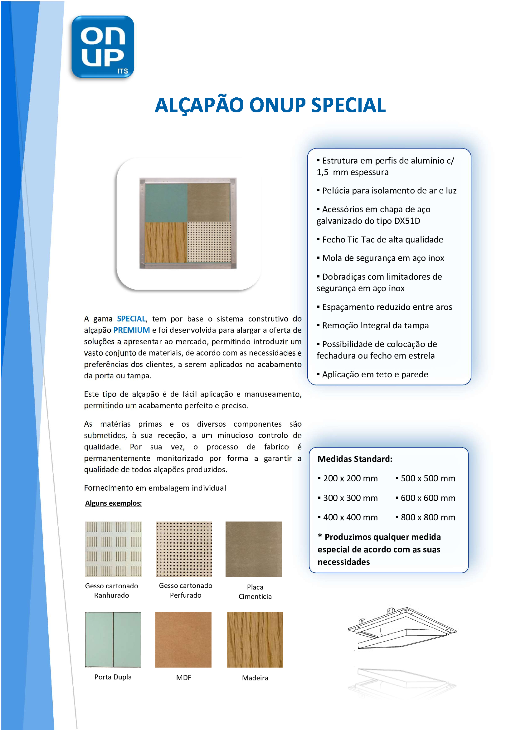 A tampa é constituída por uma placa de gesso cartonado Hidrofugo de 12,5 ou 15 mm, permitindo a aplicação em locais húmidos. Fica suspensa no aro exterior, apoiada por quatro perfis de alumínio em forma de T, os quais garantem o perfeito posicionamento e alinhamento.
